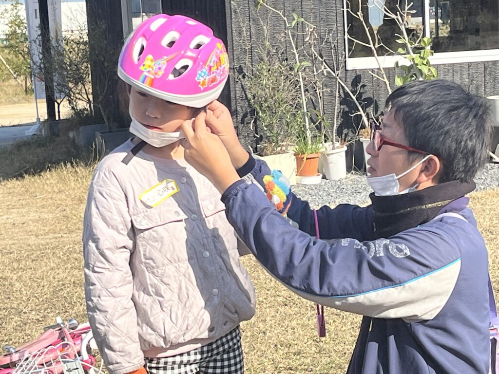 といったことが大事だそう。パパが、お子さまのヘルメットをしっかりつけて確認します。