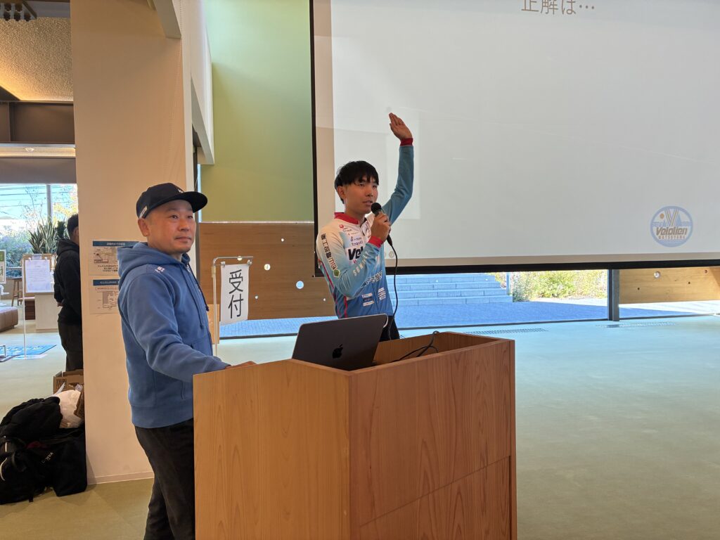 講師は第4回の今治開催に引き続き、地元愛媛のプロサイクリングチーム「Velolien(ヴェロリアン)松山」の清水監督、桂選手、新開選手の3人。