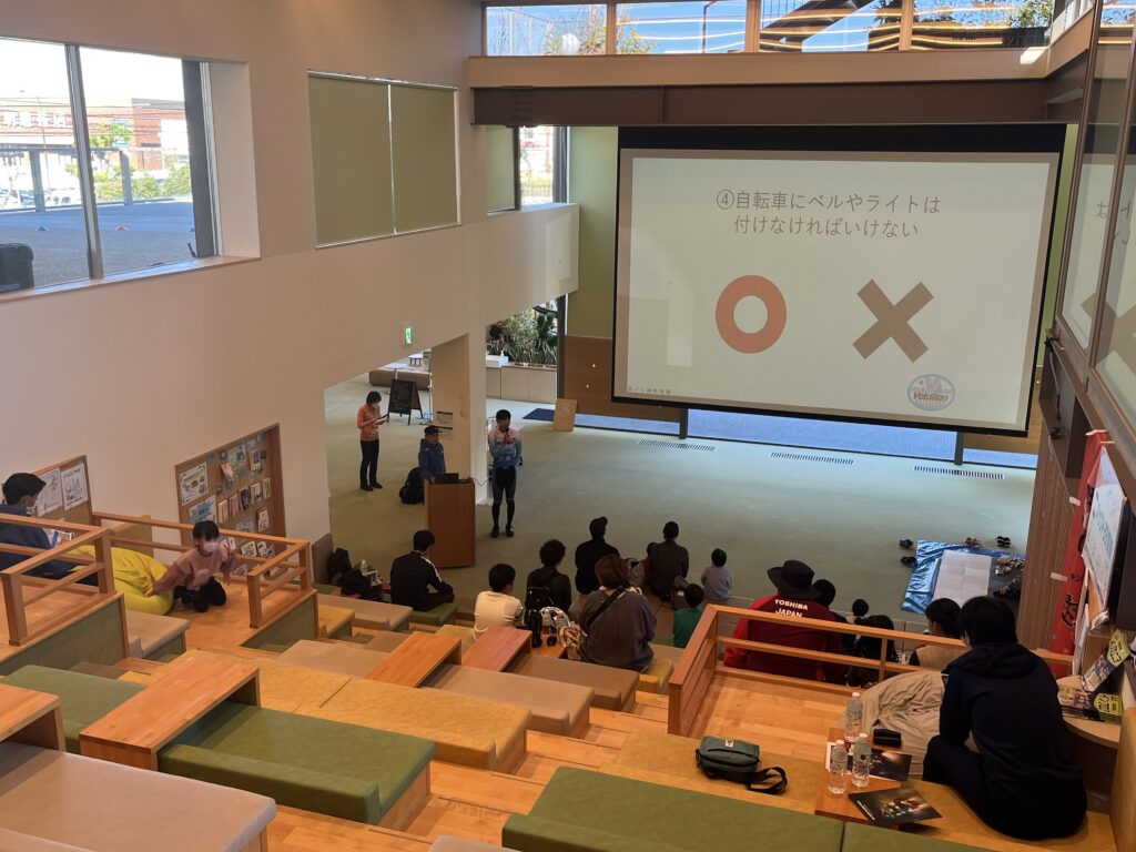 講師の自己紹介の後、クイズで自転車に安全に乗るルールをおさらいします。