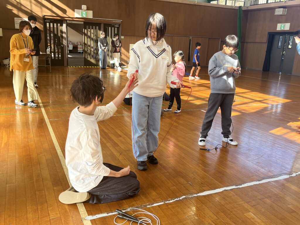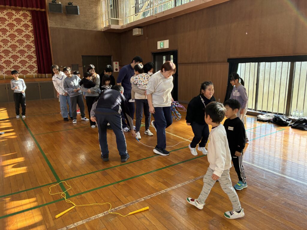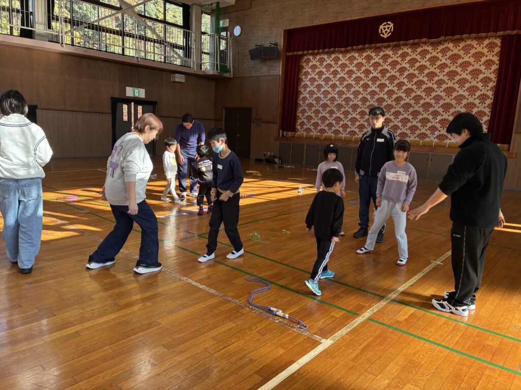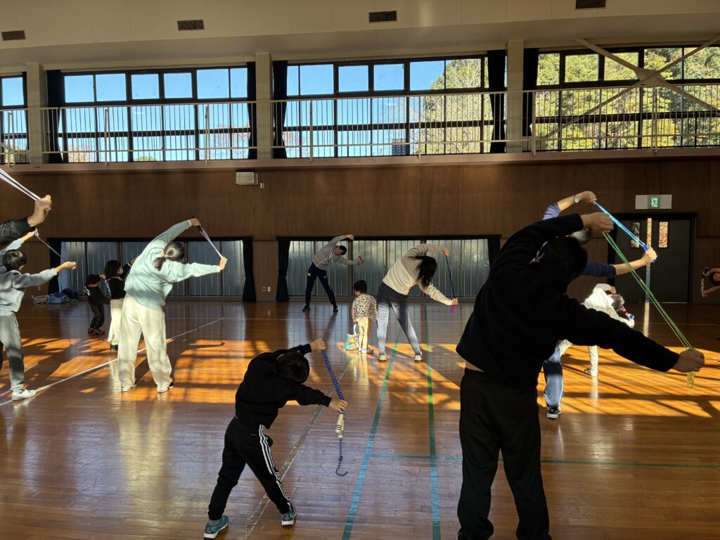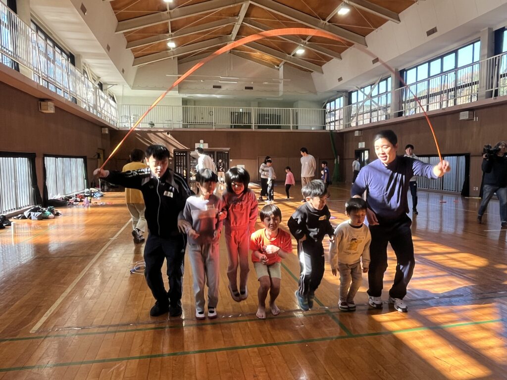 1つの縄を2人で回したり、親子で一緒に跳んだり。