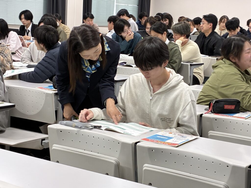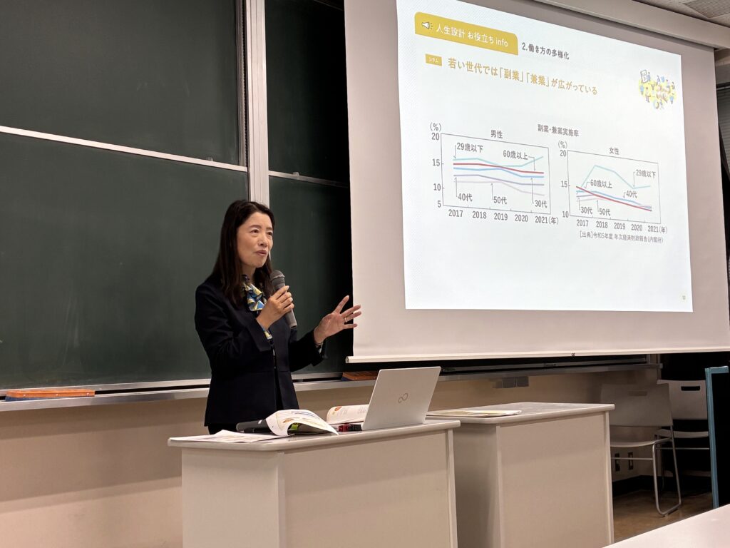 講義は、この後、人口減少問題や晩婚化、出産や結婚などで退職する女性が多い事にも触れていき、より理解を深めるため、何度か質問タイムを設けました。